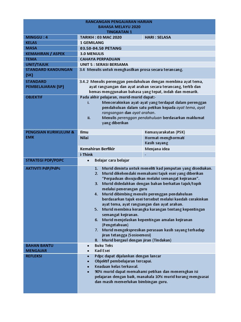 Rancangan Pengajaran Harian Bahasa Melayu Tingkatan 1