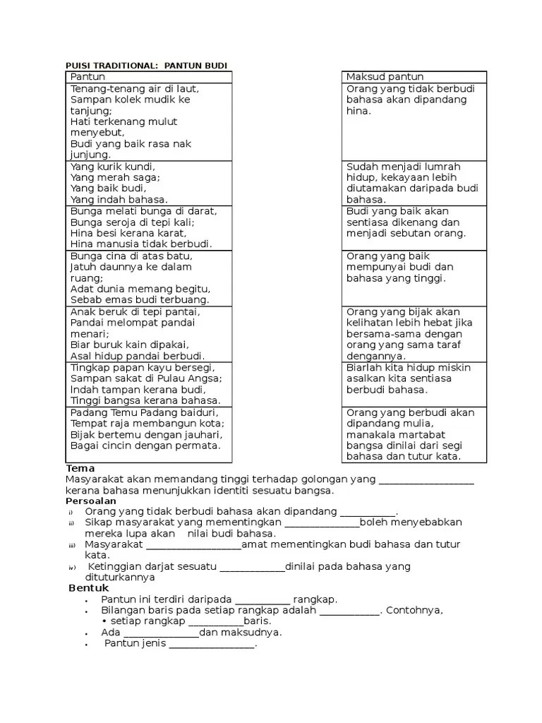 Pantun Budi K Maksud Tema Persoalan Bentuk Gaya Bahasa Nilai Pengajaran Bumi Gemilang